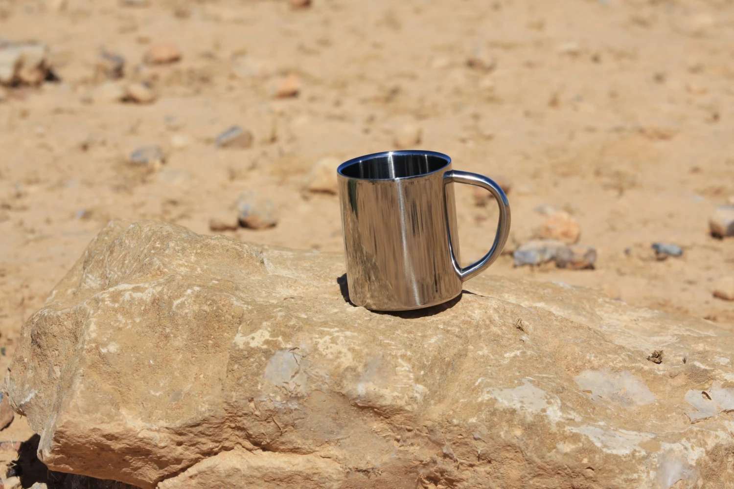 Stabiler Thermobecher mit Doppelwandkonstruktion und elegantem und griffgünstigen Edelstahlgriff. Super poliert und in schönem Design. Spülmaschinenfest.