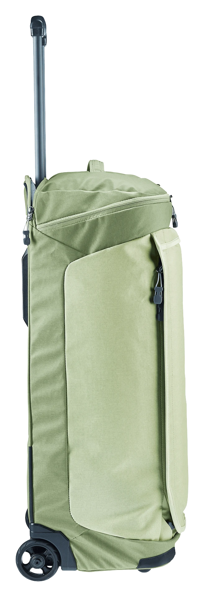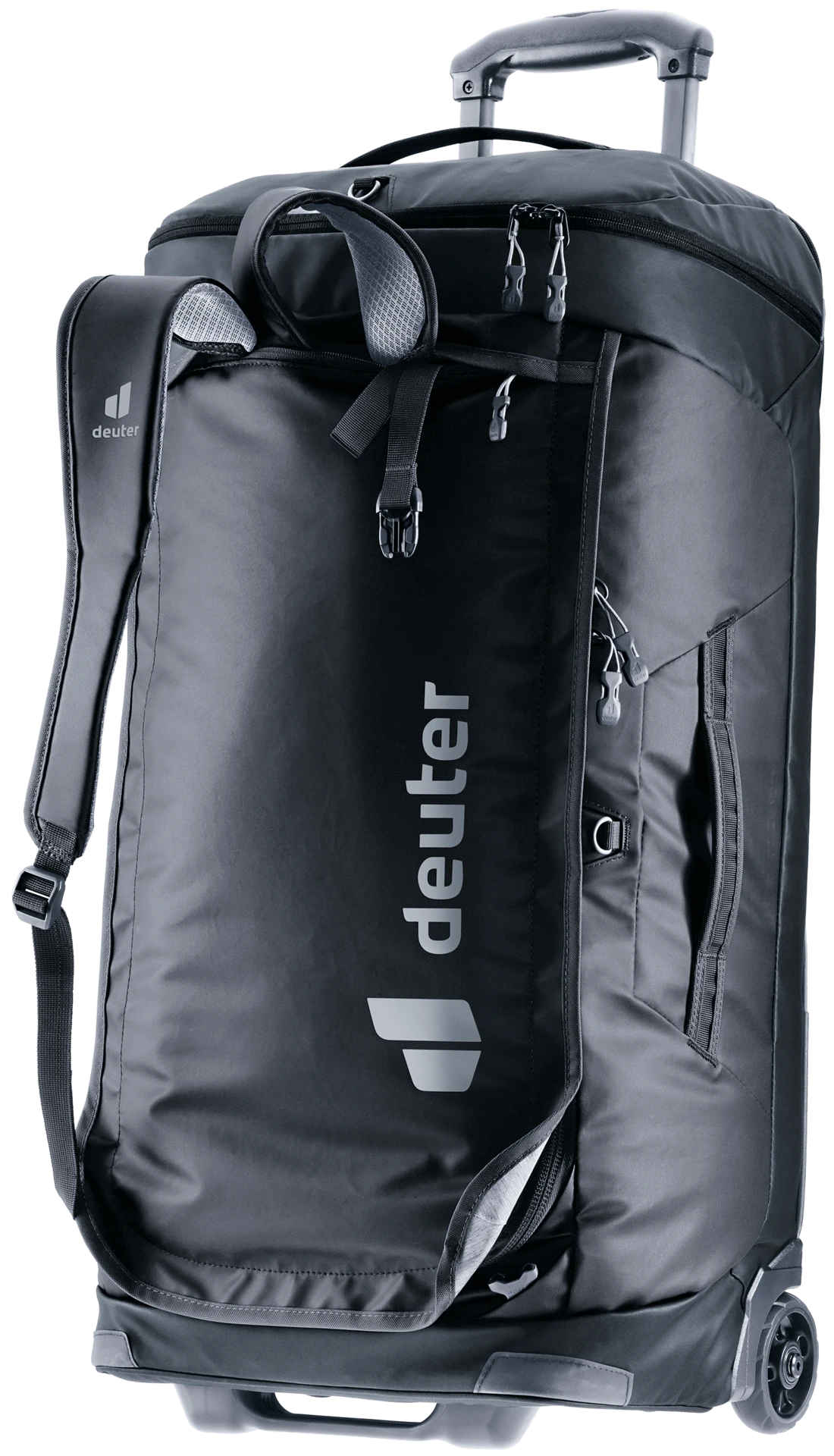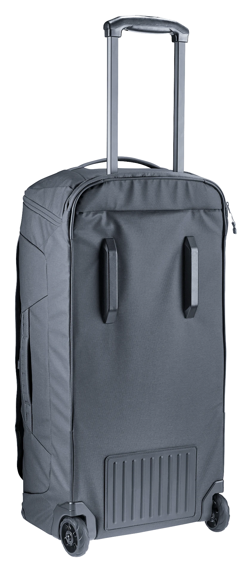 durch das neue Trolleysystem, mit zwei leisen, robusten und auswechselbaren Rollen sowie einem herausziehbaren Griff. Mit den verstaubaren Schulterträgern lässt sich der Trolley auch angenehm auf dem Rücken tragen.
