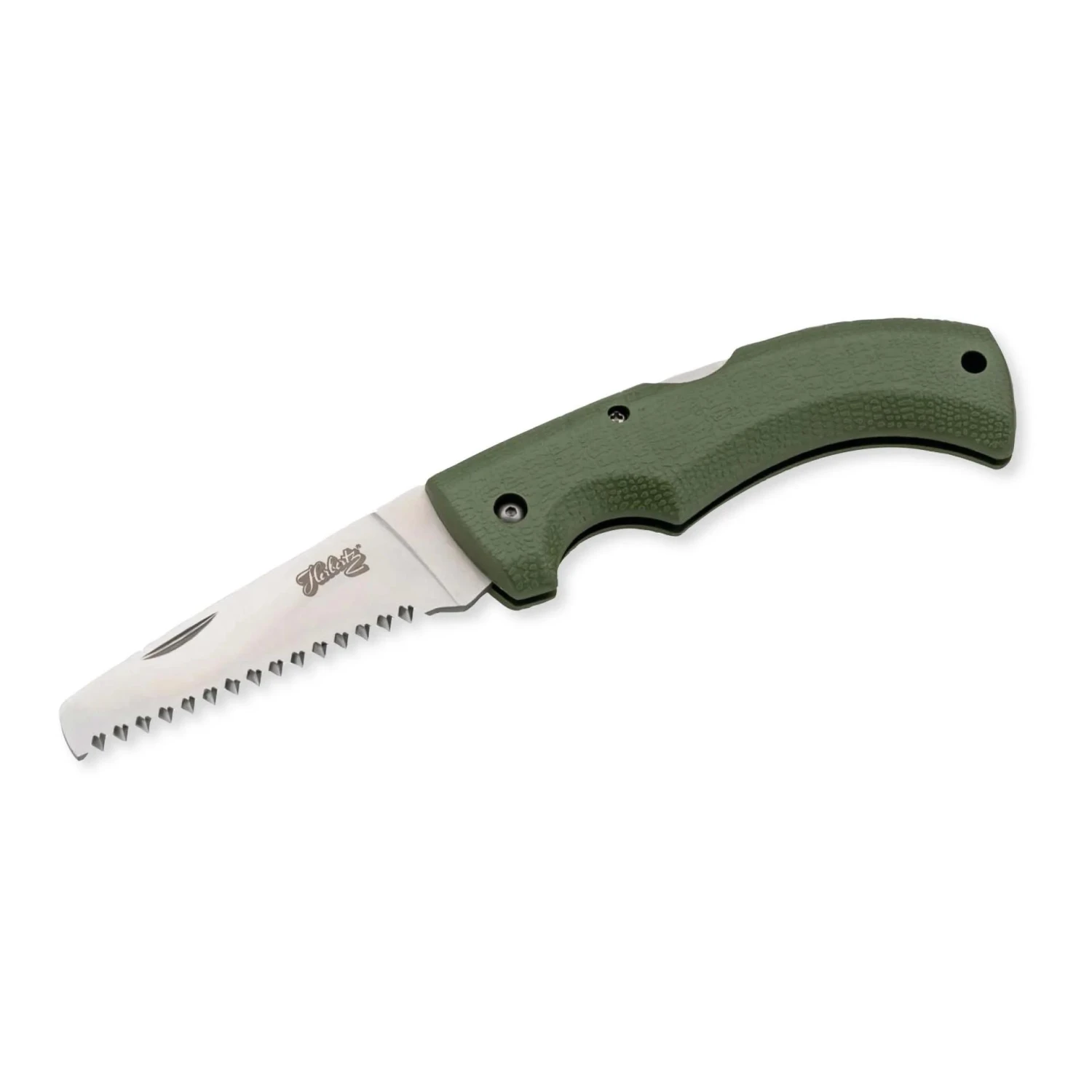 Bei dieser kompakten Klappsäge von Herbertz werden Taschenmessergriff und Säge miteinander kombiniert. Die doppelt gezahnte Säge aus 3mm starkem, rostfreiem 3Cr13 Stahl wird beim Arbeiten von einer robusten Back Lock Arretierung gesichert. Der olivfarbene Griff aus rutschhemmendem Gummi liegt auch bei nassen Händen sicher in der Hand. Inklusive Fangriemenöse.