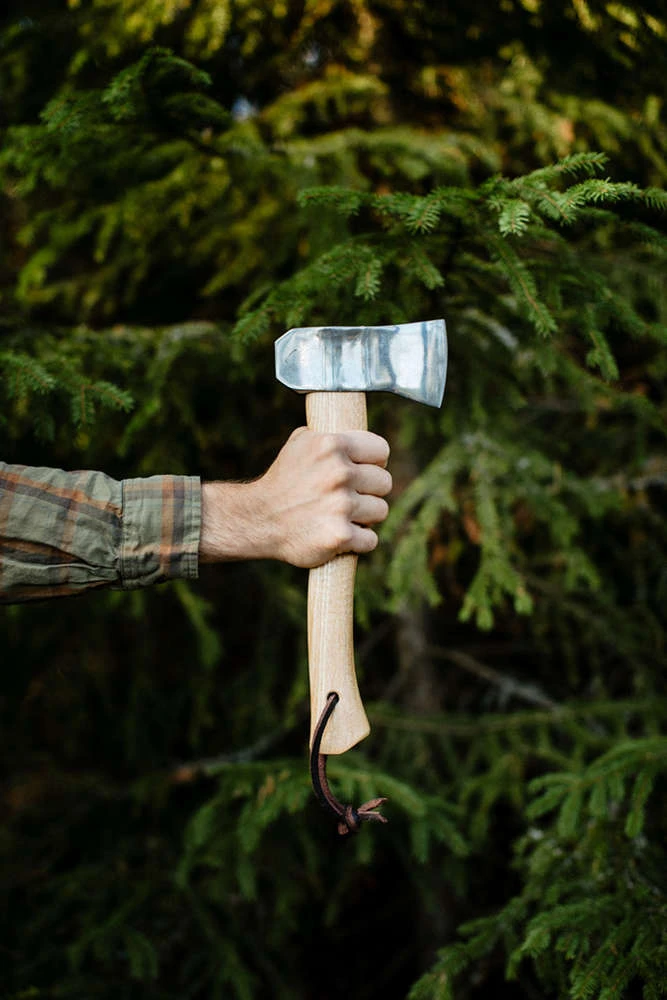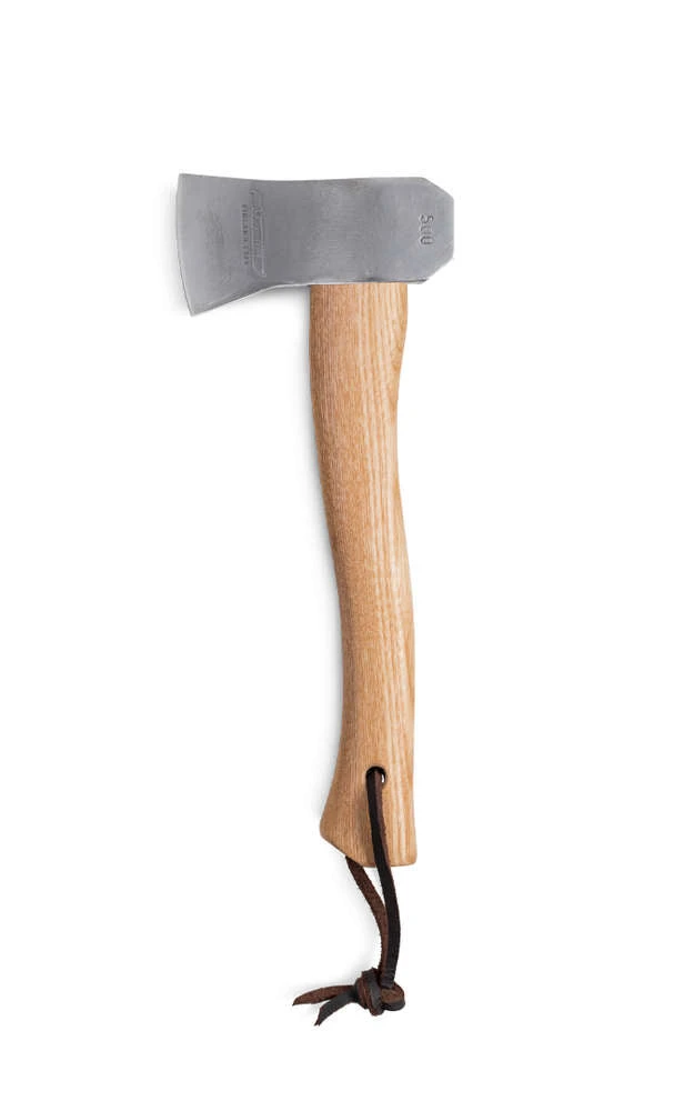 Bei den Materialien dieser praktischen Axt setzt Marttiini auf hochwertigen Kohlenstoffstahl, wunderschönes Eschenholz und zeitloses Leder.