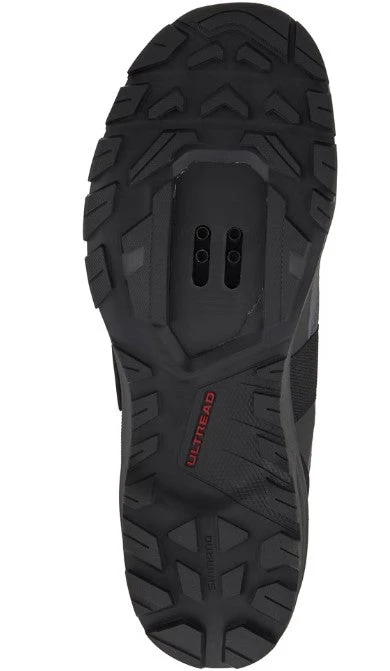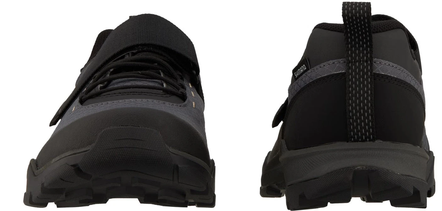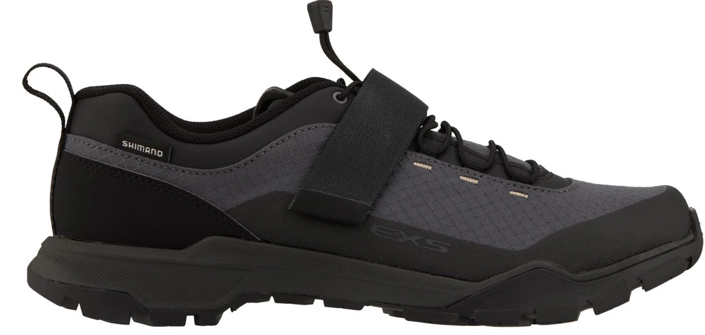 Der Shimano SH-EX500, kurz EX5 genannt, ist ein sportlicher, stylischer Tourenschuh für SPD-Pedale und wurde mit einem schnell einstellbaren Schnürsenkel-Verschluss plus zusätzlichem Klettriemen ausgestattet. Seine leichte, besonders griffige Ultread-EX-Außensohle sorgt für Traktion beim Fahren und genauso beim Gehen. Dabei wird der Gehkomfort durch die großzügige Passform und eine schaumstoffgedämpfte Zwischensohle zusätzlich verbessert. Der perfekt sitzende Oberschuh kombiniert langlebiges Kunstleder mit atmungsaktivem Netzgewebe, welches einem Recycling-Prozess entstammt. Die Cleat-Aufnahme hat Shimano am Mittelfuß positioniert, was gerade bei nicht allzu schneller Trittfrequenz angenehmer ist. Im Vorfußbereich profitierst Du von einer breiten Kontaktfläche, die das Klappern der Schuhplatte beim Gehen reduziert und den Grip verbessert.