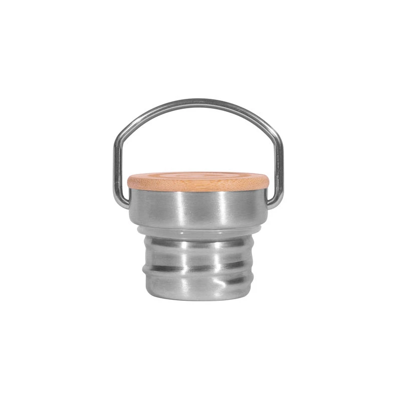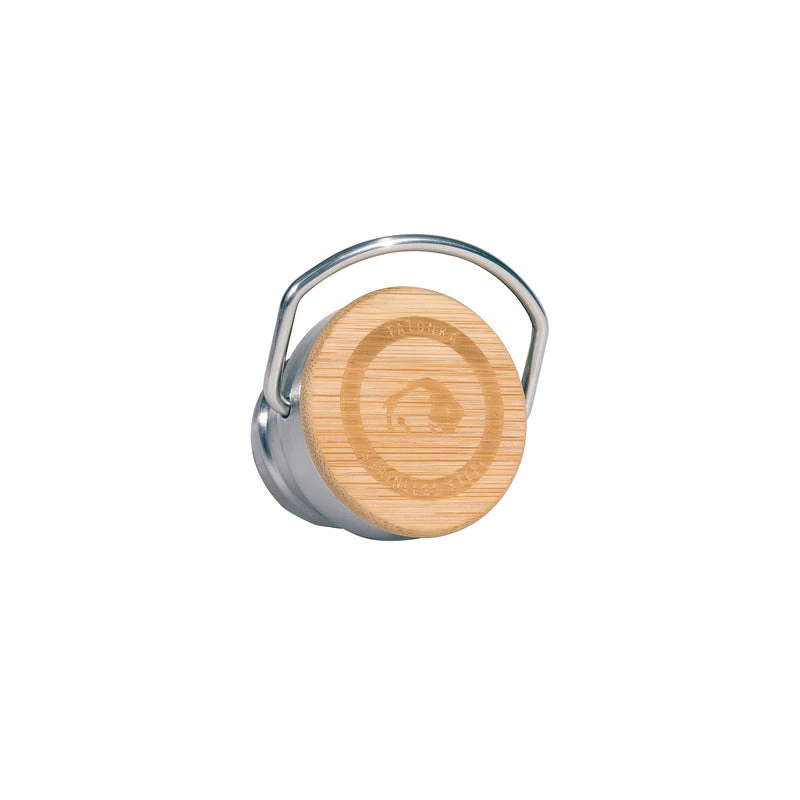 Edelstahl-/ Bambusdeckel mit großer Öse. Der Ersatz- oder Zweitdeckel für die Steel Bottle Premium ermöglicht die Befestigung der Flasche am Rucksack, indem man einen Karabiner an der Öse befestigt.