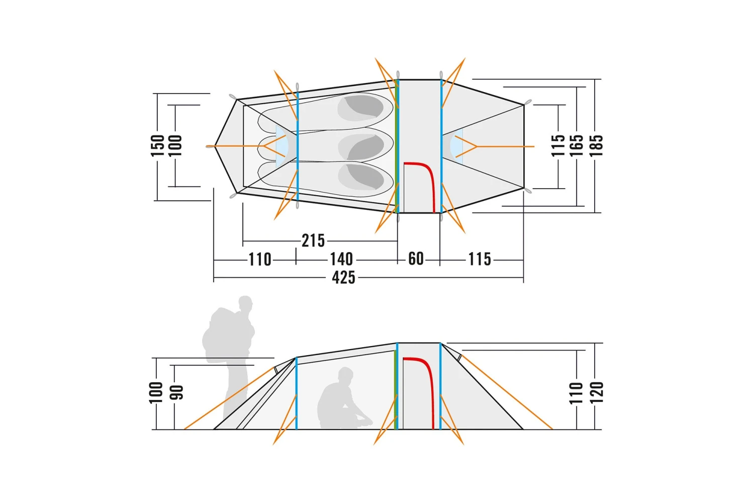 Das Außenzelt des 3-Personen-Zeltes ist aus leichtem, auf der Innenseite vierfach PU-beschichtetem, wasserdichtem Polyester mit einer eine Wassersäule von 8.000 mm gefertigt. Das Material ist farbecht und UV-beständig. Der wasserdichte Zeltboden aus PU-beschichtetem Nylon mit einer Wassersäule von 10.000 mm schützt optimal vor Nässe von unten. Das Innenzelt besteht aus luftdurchlässigem Nylonmaterial, das Zeltgestänge aus Aluminium ist leicht und bruchfest.