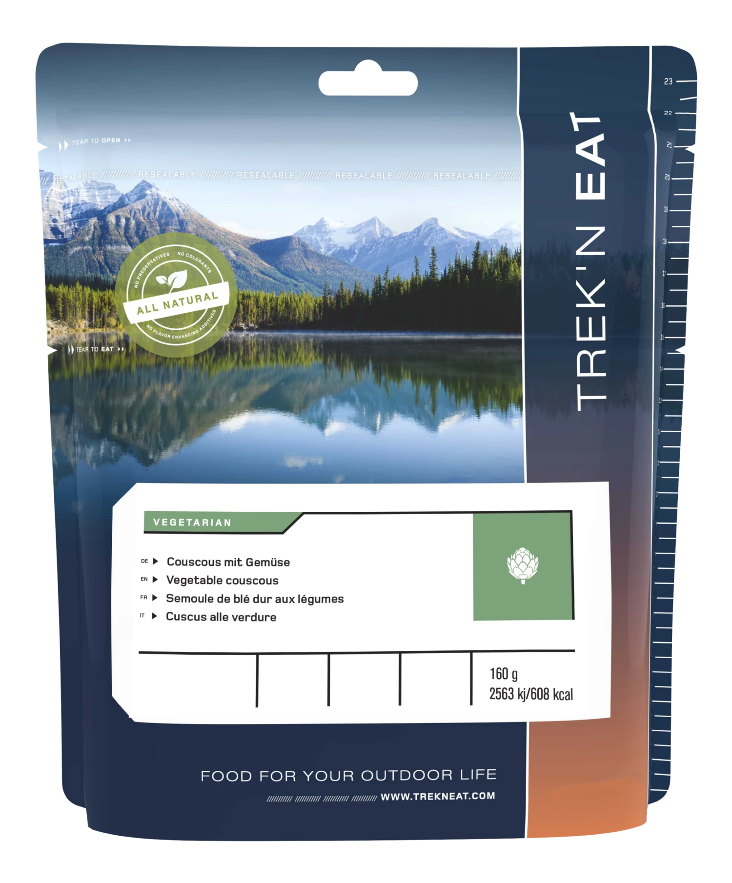 Nordafrikanischer Genuss und vegane Frische: Das Couscous mit Gemüse ist der perfekte Mix für alle, die gut gestärkt mit einem rein pflanzlichen und extrem leckeren Gericht unterwegs sein wollen. Für frischen Geschmack sorgen verschiedenste Gemüsesorten, die sich harmonisch mit den typischen Gewürzen und dem Hartweizengrieß aus der nordafrikanischen Küche verbinden. Einfach kochendes Wasser bis zur Fülllinie direkt in den wieder verschließbaren Standbeutel gießen, umrühren, kurz ziehen lassen und den Hauch von Marokko genießen. Das leichte und fettarme Gericht von Trek’n Eat wird zum Muss bei jedem Outdoor-Abenteuer.