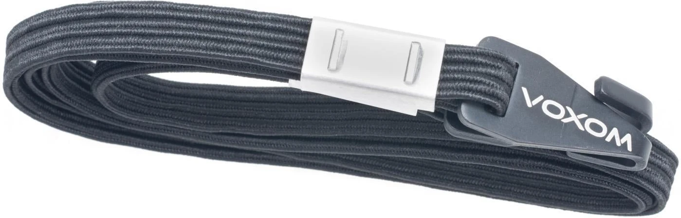 Elastischer Spanngurt von Voxom mit Haken zur Verwendung am Gepäckträger. Mit zwei Zügen, um das Gepäck sicher am Fahrrad zu halten.